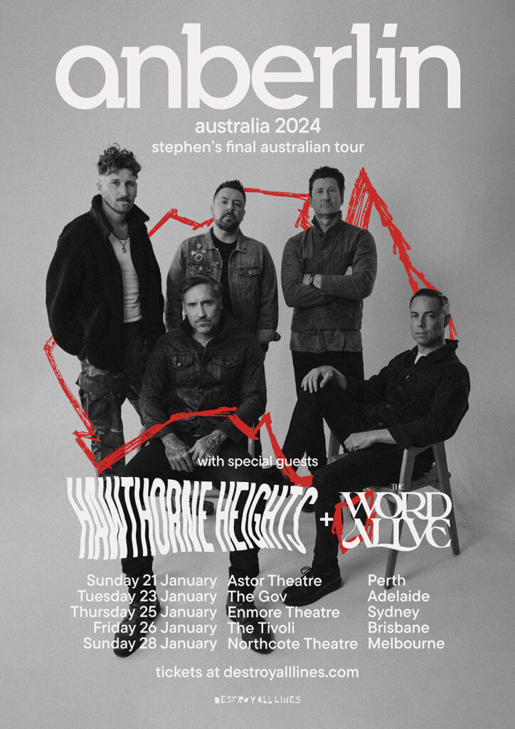 “There is not a country outside the United States that Anberlin is more connected to or embraced as much as Australia, and this will be our 12th trip to this incredible country. From our first show in Adelaide, to then writing a song about it, and years later having a 9-year-old girl named Adelaide come on stage and sing that very song with us to a massive sold-out show in Sydney we have SO many core memories created on that soil. It is absolutely fitting that I am taking a final bow in Australia before taking a long hiatus from touring. I appreciate you Australia and can’t wait to sing along one final time.”  Stephen Christian, Anberlin