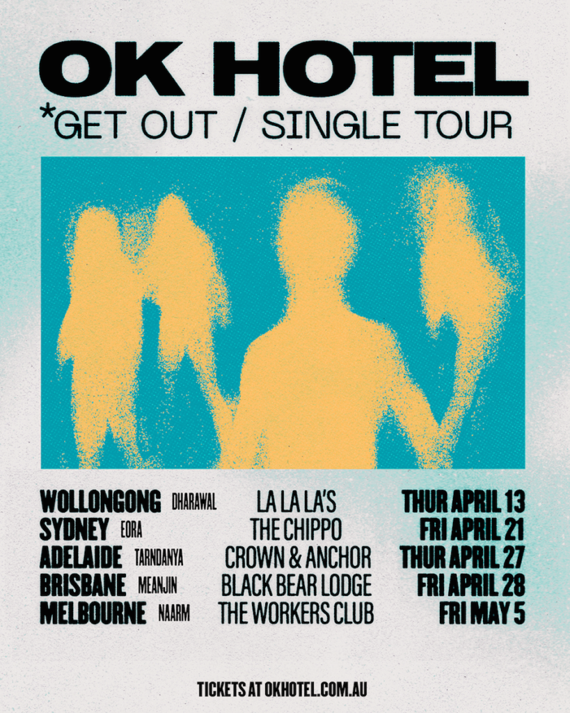 OK Hotel spent the early half of 2022 back in the studio recording their new EP with the first single “Get Out” released 13th March 2023. Produced and Mixed by Fletcher Matthews (Trophy Eyes, The Buoys, Dear Seattle, CLEWS) and Mastered in the US by Will Yip (Turnstile, Lauren Hill, Tigers Jaw, Title Fight).