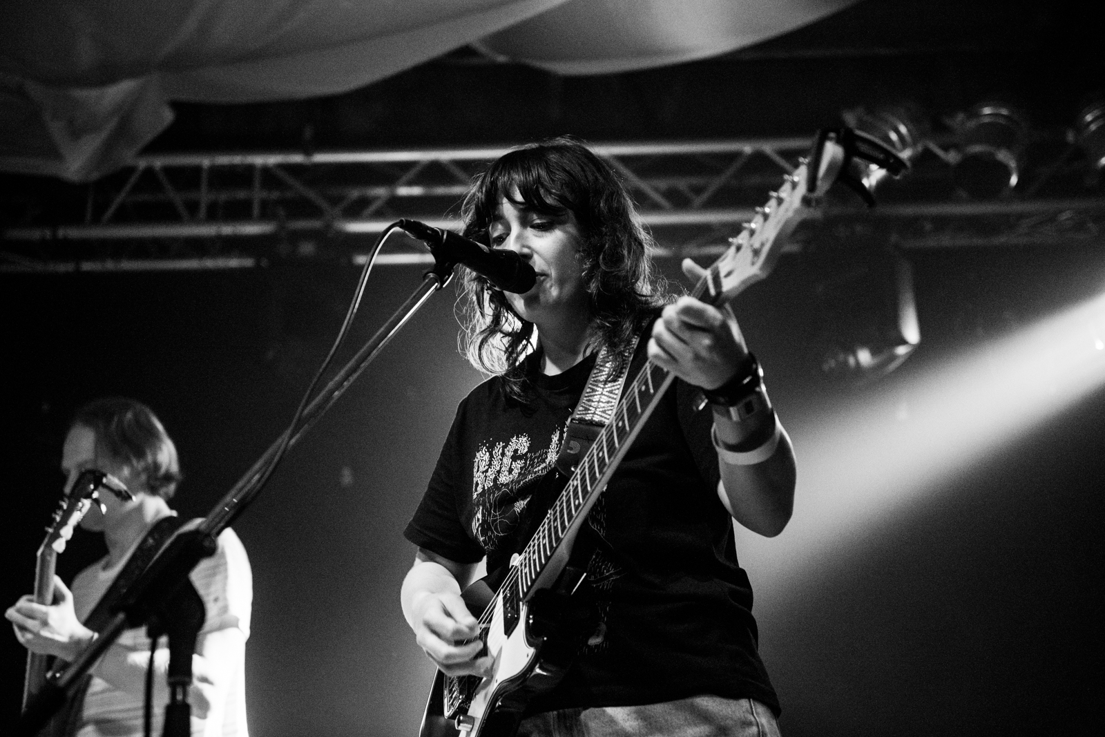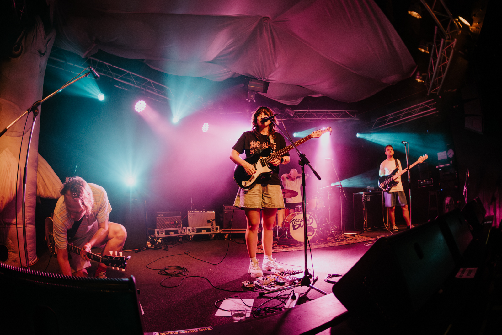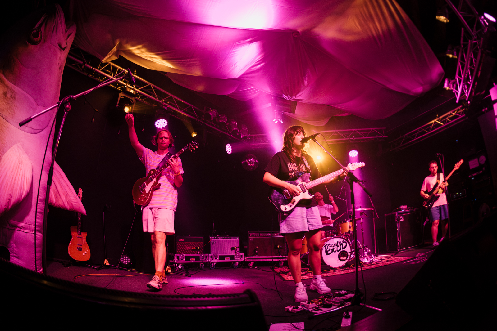 The stage went dark, with all of the lights were turned off, as The Beths made their way on stage with the applause and cheers continuing louder and more urgent. A catchy boppy beat played through the speakers overhead with the stage lighting up with perfectly synched timing as The Beths played their instruments on the next note as the beat ended. The crowd couldn’t get enough of this entrance from The Beths, an indie four piece from the land of the long white cloud, New Zealand. The packed band room was standing room only in front of the main stage, with the crowd grooving along like a moving wave of bodies swaying rhythmically together and nobody standing still. The crowd were giving The Beths the same energy as they were exuding from their stage presence.