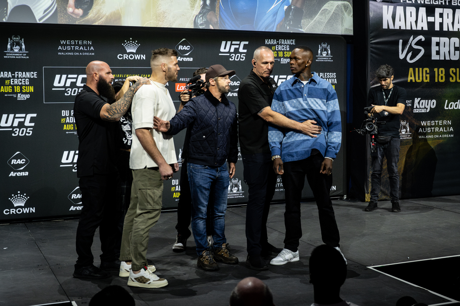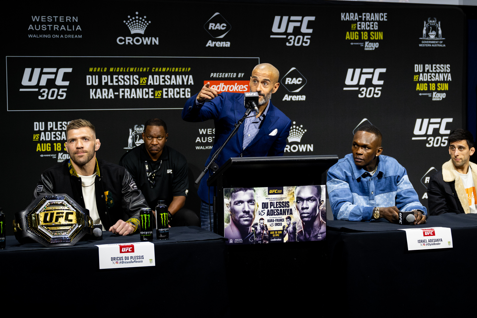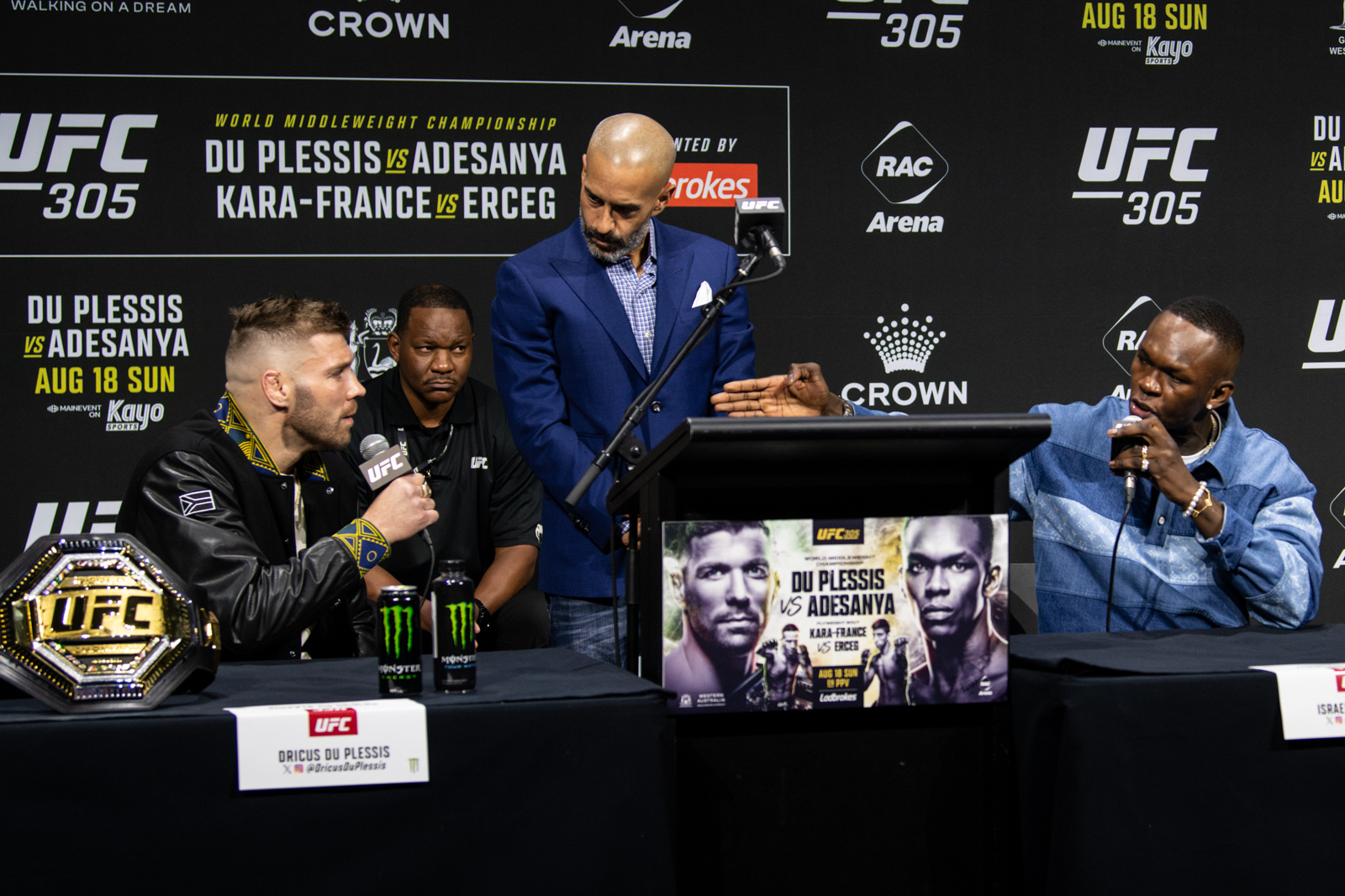 Emotions were high during a heated UFC 305 press conference at Perth’s RAC Arena with Israel Adesanya looking visibly shaken by the event’s end. As expected, all eyes were on Adesanya and his opponent, UFC Middleweight Champion Dricus Du Plessis, with Adesanya taking strong umbrage to DDP’s repeated jabs at his supposed privileged upbringing.