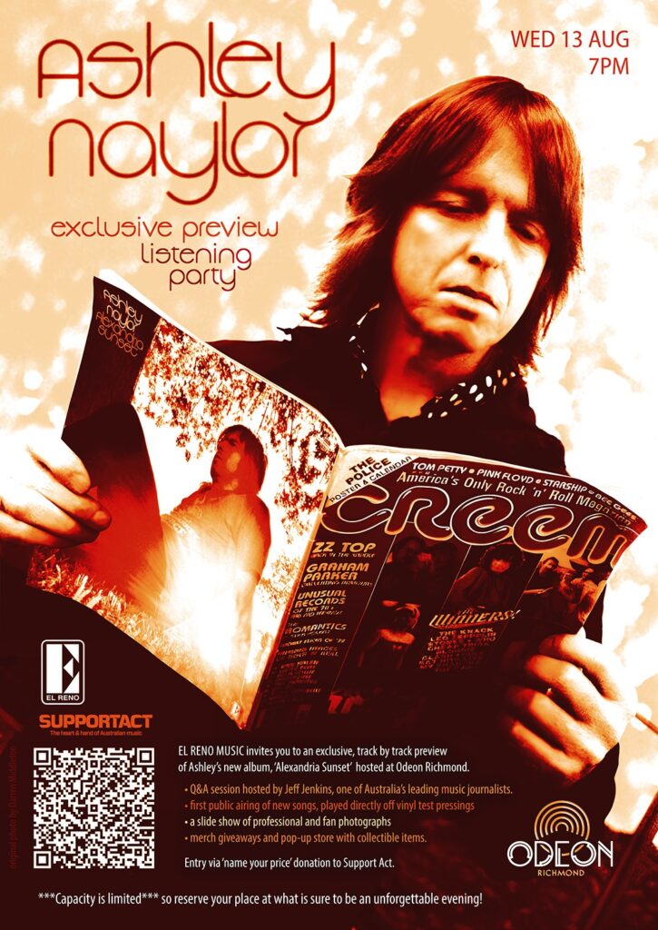 Ashley Naylor has announced a Wednesday August 13 exclusive preview listening party at Odeon Richmond for his new album Alexandria Sunset.