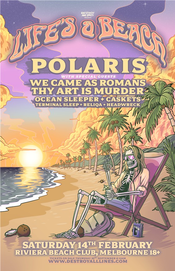 Headlined and curated by POLARIS, also marking the final live celebration of their acclaimed 2023 album Fatalism leading into a brand new chapter, LIFE’S A BEACH will feature some of Australia’s most exciting up-and-coming artists alongside some international icons including WE CAME AS ROMANS (USA), THY ART IS MURDEROCEAN SLEEPER, CASKETS (UK), TERMINAL SLEEP, RELIQA and HEADWRECK.
