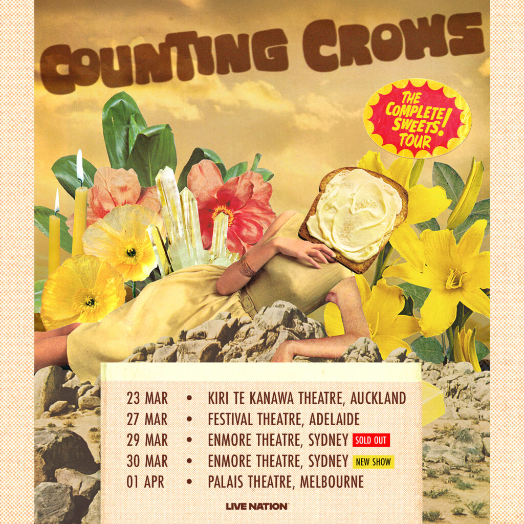 Counting Crows will commence The Complete Sweets! Tour in Auckland at Kiri Te Kanawa Theatre on Monday 23 March, before heading to Australia for a show at Festival Theatre, Adelaide on Friday 27 March, followed by Sydney’s Enmore Theatre on Sunday 29 and Monday 30 March, and finishing in Melbourne at Palais Theatre on Wednesday 1 April.