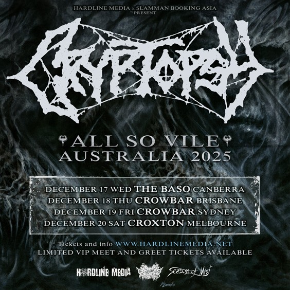 One of the world’s most brutal Death Metal bands, the mighty CRYPTOPSY, are just weeks away from headlining 4 shows throughout Australia to close out the year as part of their ALL SO VILE tour!!!