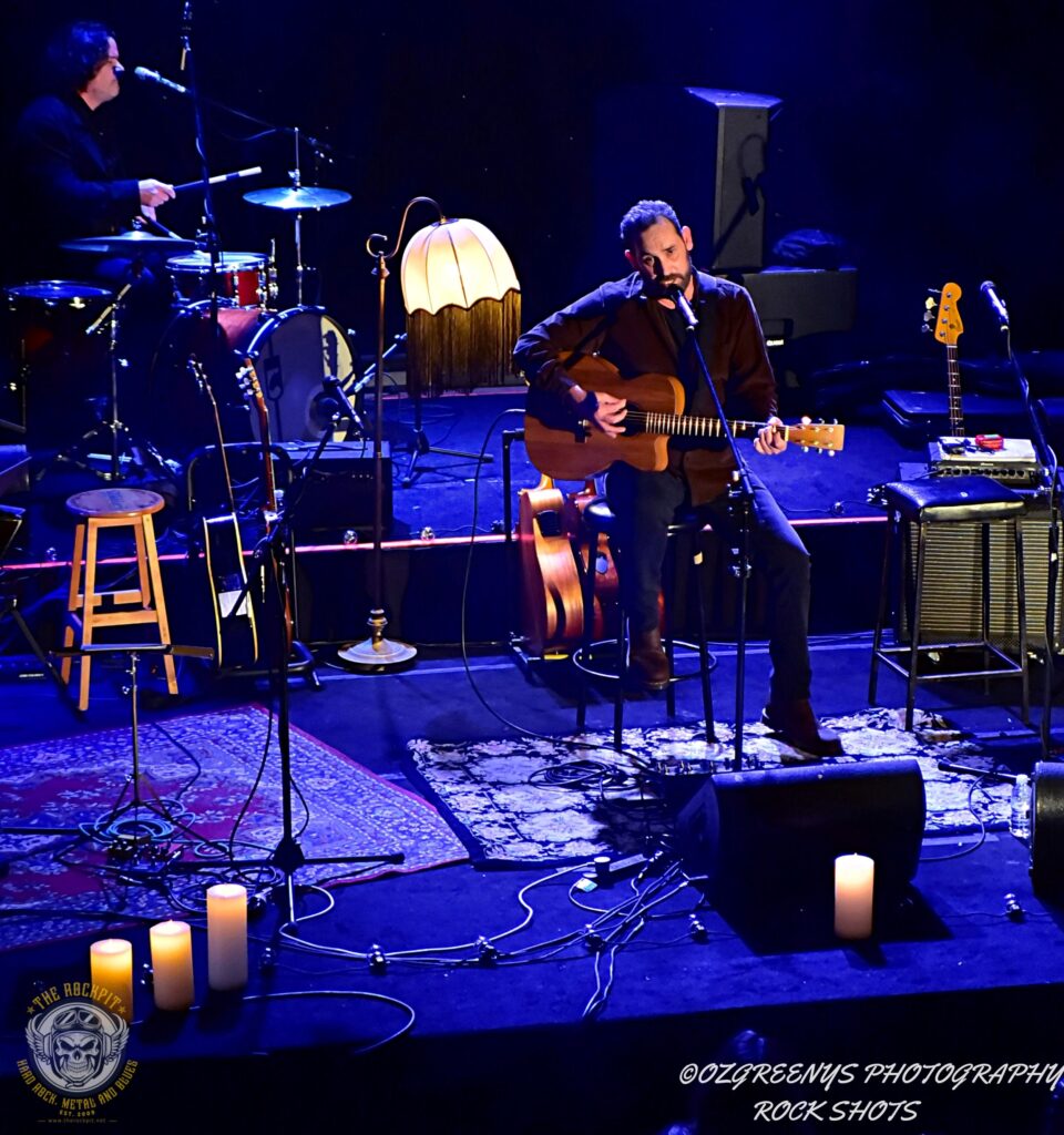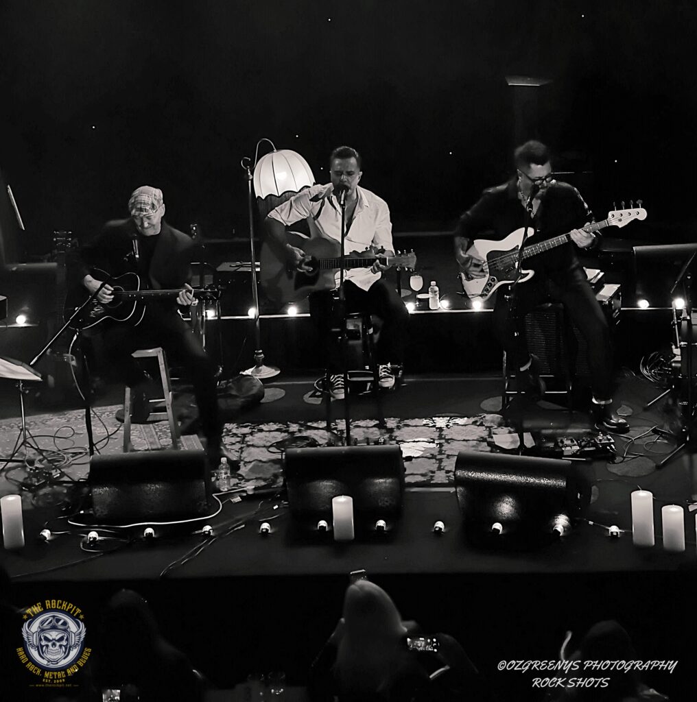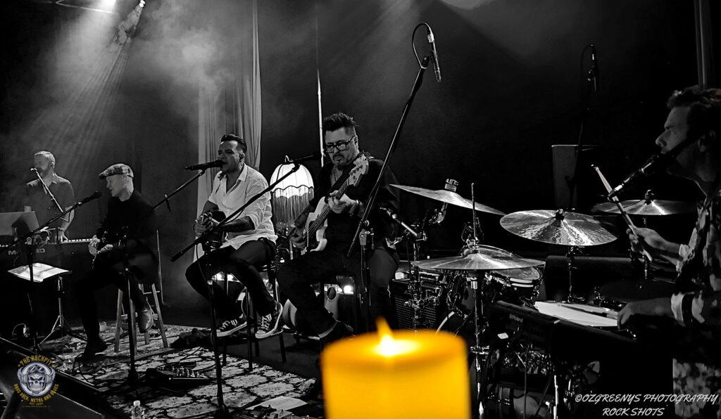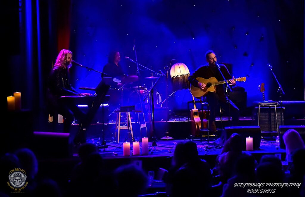 With a starry night back drop and candles burning in the front of the stage “I want my MTV” Dire Straits starts playing and out walks the talented 5-piece. With Jeremy on the keyboard and banjira, Jimi on acoustic guitar and mandolin, Jason on acoustic guitar, Stu on bass and Pete on drums. Jimi, Jason and Stu are front and centre with the keyboard on one side and drums on the other. The lamp and candles make it feel like we are spying in the windows of someone’s lounge room. Just like the MTV unplugged tradition this show is stripped back and acoustic. It feels intimate even though we are in a big music hall, This is Monstr’s big debut performance and the band joke that they have only just learnt the songs and have had very limited rehearsal time. They open with Nirvana’s “About A Girl” sung by Jason and then Jimi sings “The Man Who Sold the World”.