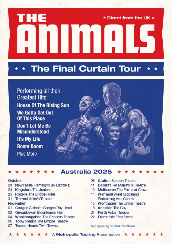 Still on the prowl, The Animals are still commanding great respect internationally amongst their peers as well as from fans of all ages – crowds still adore edgy anthems from The Animals catalogue such as the classics, ‘We Gotta Get Out Of This Place’, ‘Boom Boom’, ‘Don’t Let Me Be Misunderstood’, ‘It’s My Life’ and the bands’ iconic multi-million selling, and Number One worldwide, hit – ‘House of The Rising Sun’
