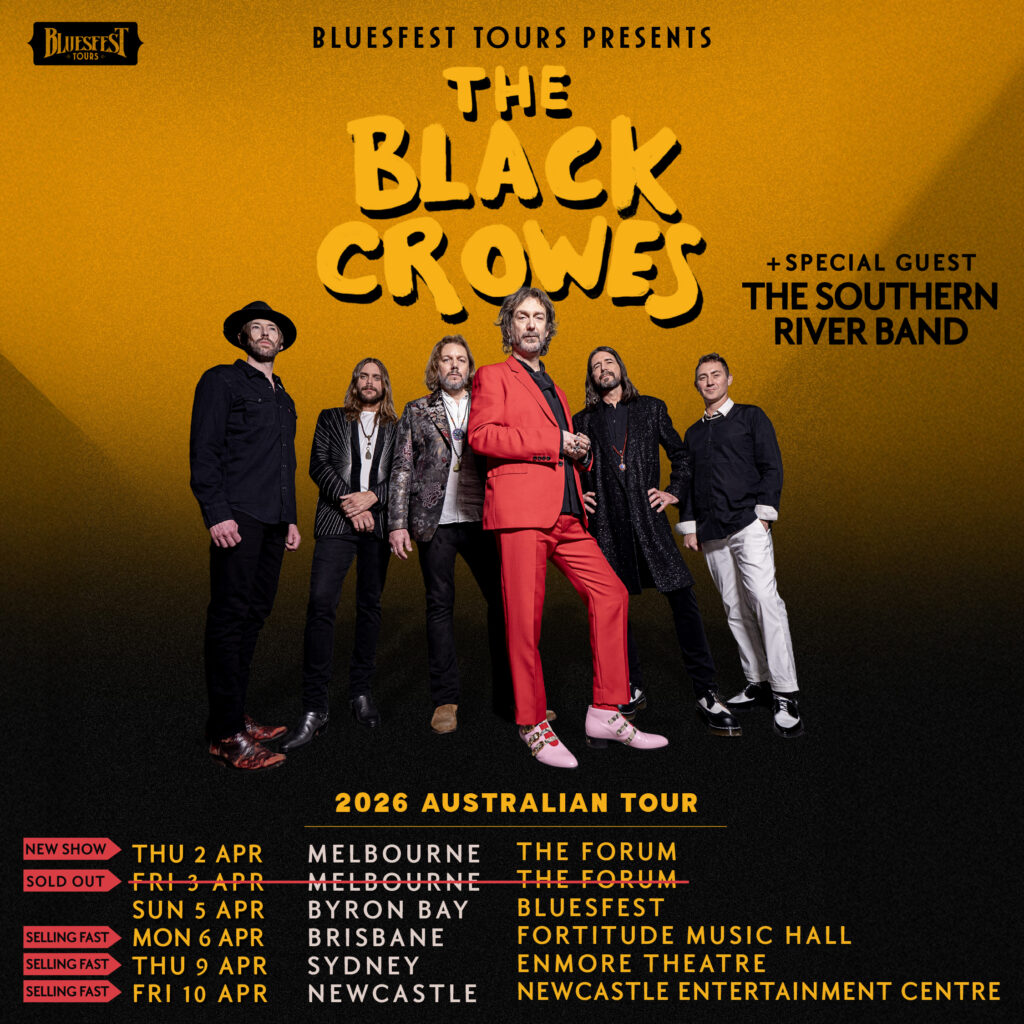 Bluesfest Tours is proud to announce that due to overwhelming demand, global rock & roll icons THE BLACK CROWES have added a second Melbourne headline show at The Forum on Thursday 2 April 2026. Their show at the Forum on Friday 3 April has sold out!