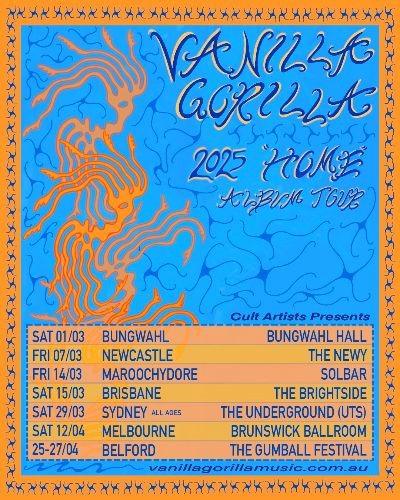The band have previously played alongside Psychedelic Porn Crumpets, The Vanns and Radio Moscow; have made appearances at Weasel Stock Festival, Spaced Out Festival, The Rolling Sets Festival, Elpalmo Pacificano, and were the winners of triple J Unearthed’s competition to open up FOTSUN back in 2018. With new music and their upcoming east-coast tour in tow, 2025 is already shaping up to be a mammoth year for Vanilla Gorilla!