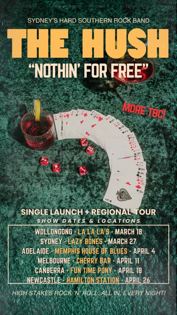 Renowned for their high-energy live shows and undeniable stage presence, The Hush have built strong momentum through packed-out shows, residencies, and interstate touring, earning a place among the “Top 20 Hardest Gigging Musicians of 2024” via Sydneymusic.net. With a fast-growing audience and a reputation forged on stage, The Hush are keeping southern-flavoured rock loud, dangerous, and very much alive.
